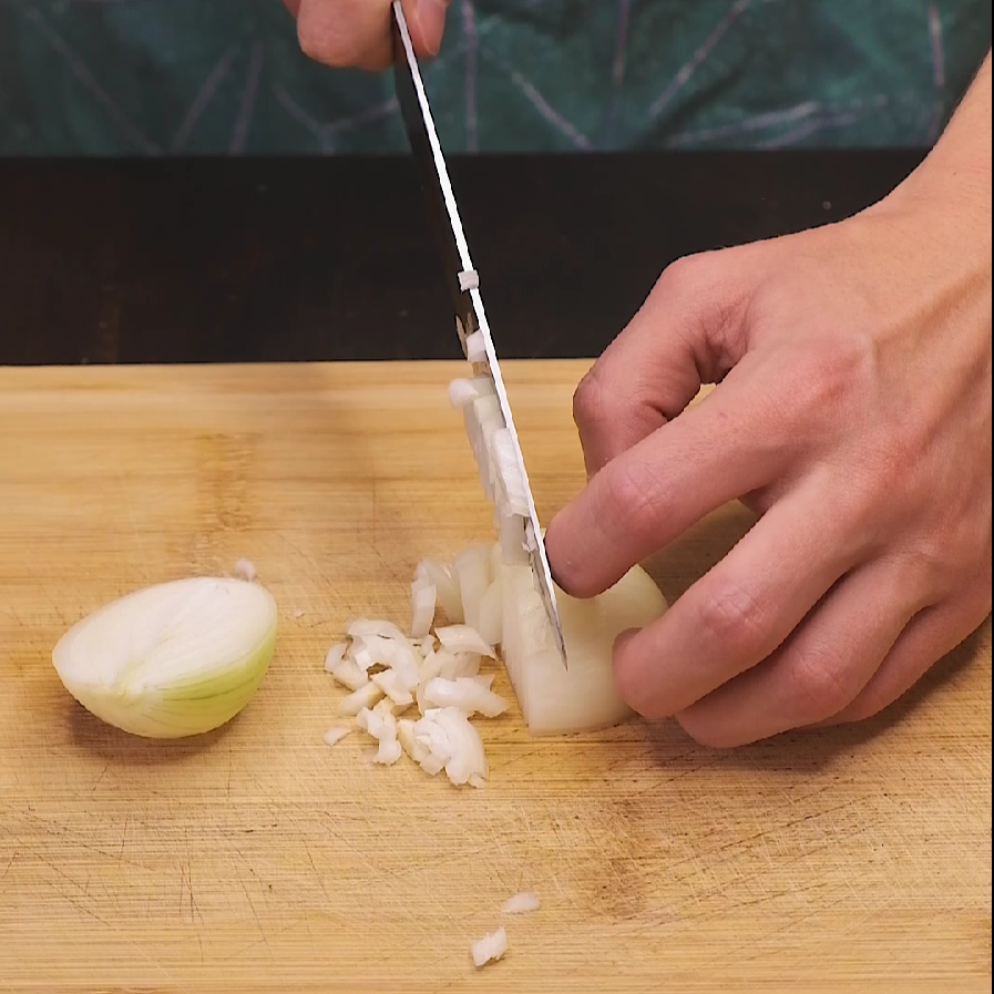 2️⃣ Vištieną išimame. Į tą patį puodą sudedame 2 smulkintus svogūnus ir 1 supjaustytą morką. Kepame, kol daržovės suminkštėja ir lengvai karamelizuojasi. Įdedame žiupsnelį druskos.