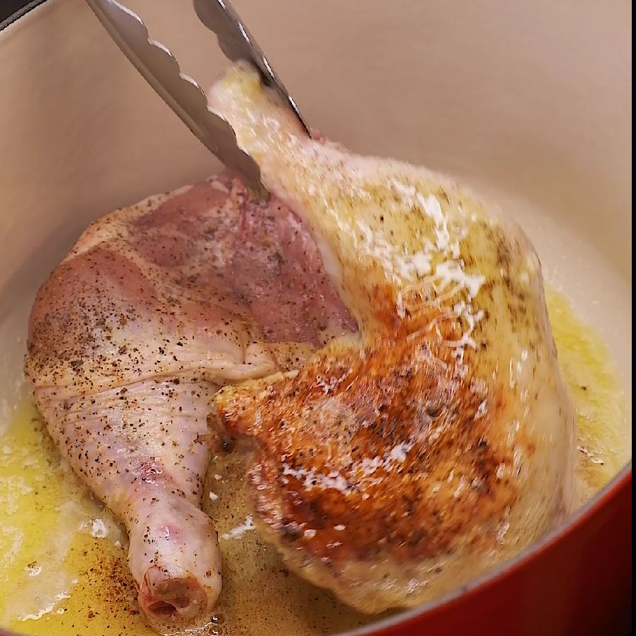 1️⃣ Vištienos ketvirčius (2 vnt.) pabarstome druska ir pipirais. Įkaitiname puode 1 valg. š. alyvuogių aliejaus ir 1 valg. š. sviesto, dedame vištieną ir apkepame, kol ji gražiai apskrunda iš visų pusių.