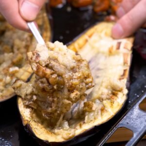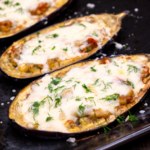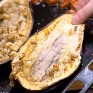 Paruoštą masę sudedame atgal į baklažano puseles.
