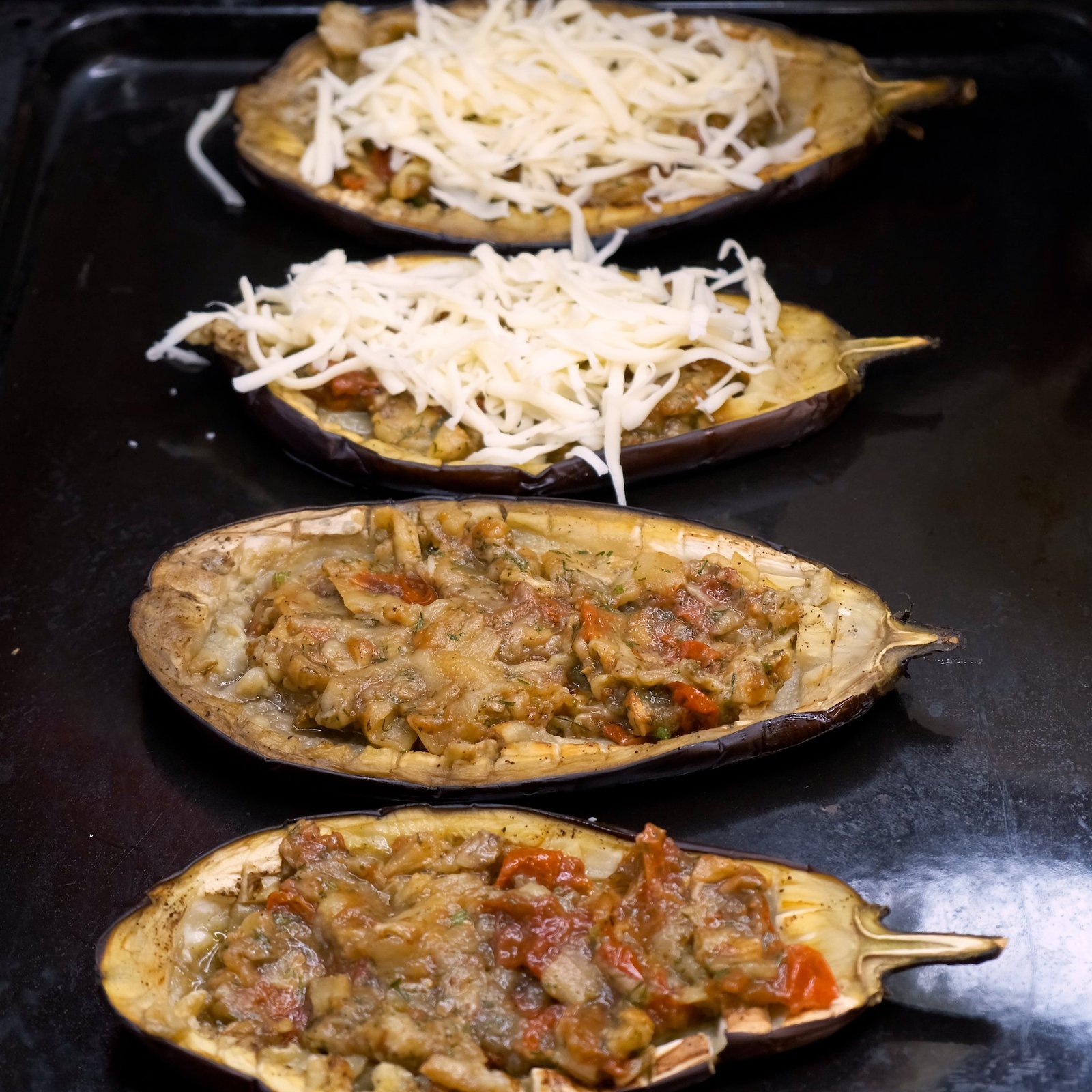Paruoštą masę sudedame atgal į baklažano puseles.