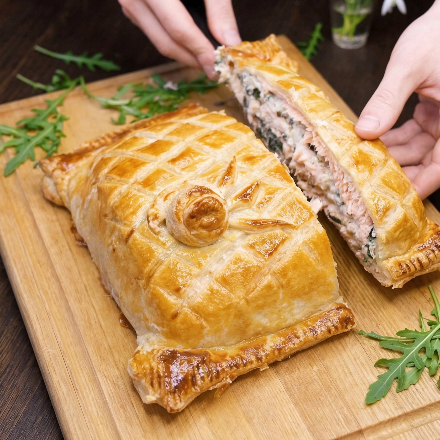 Paruoštą lašišą tešloje perkelkite į kepimo popieriumi išklotą skardą ar formą ir padėkite 10 minučių į šaldytuvą. Taip tešla geriau išlaikys formą 🥐