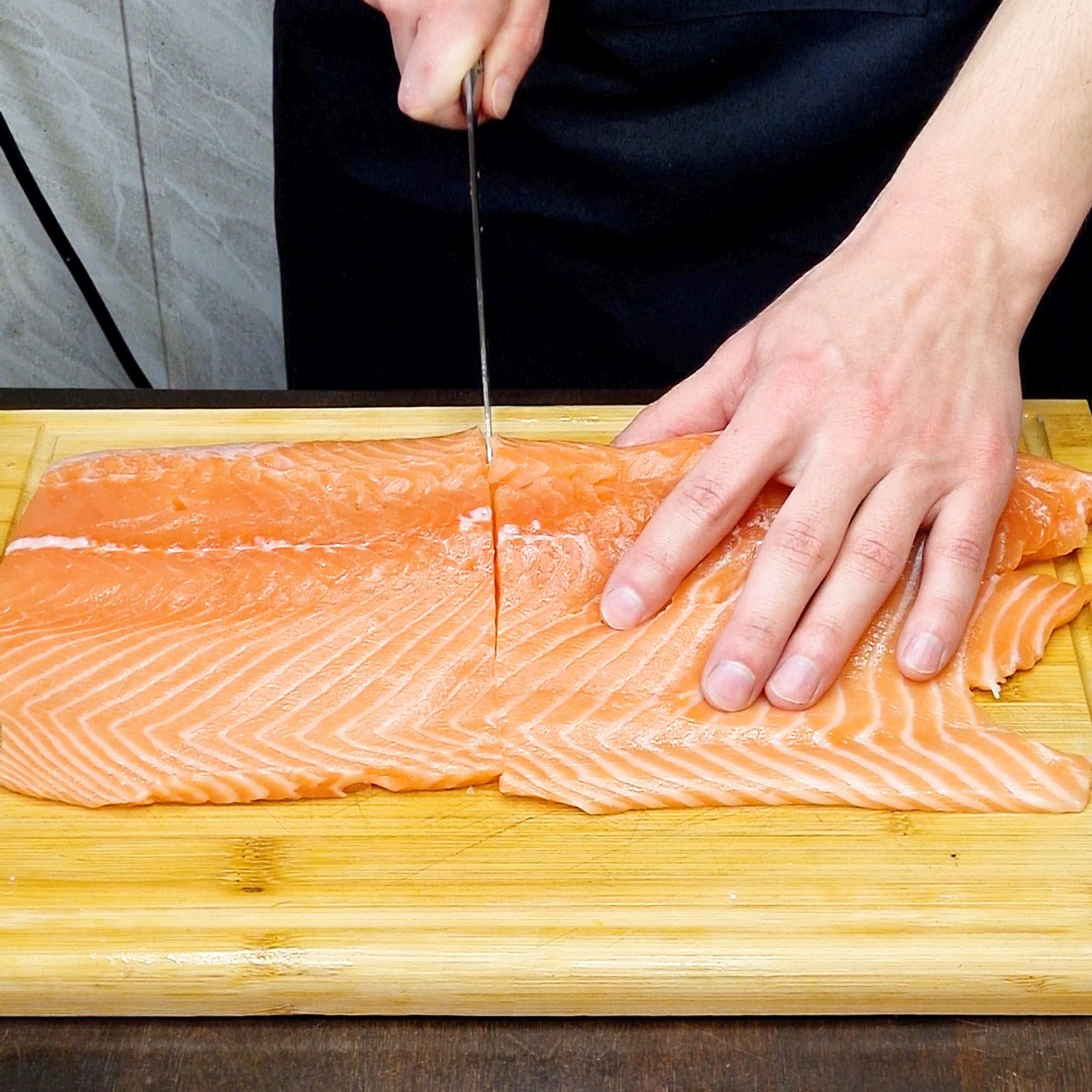 Lašišos filė perpjaukite į dvi panašaus dydžio dalis. Jas lengvai pagardinkite druska ir palikite apie 30 minučių pastovėti kambario temperatūroje.