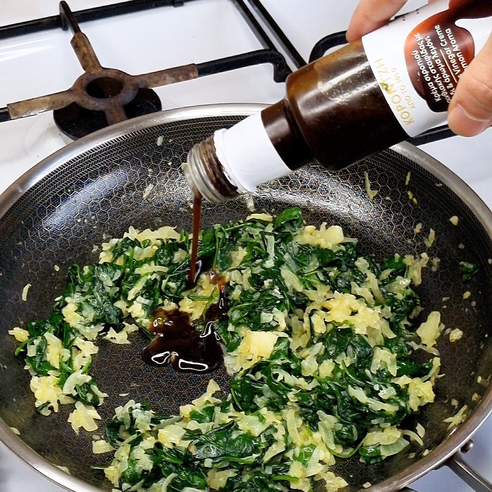 Sudėkite špinatus ir kepkite maišydami, kol jie sukris ir išleis kuo daugiau vandens. Tai svarbu, kad įdaras nebūtų per skystas ir vėliau nesuminkštintų tešlos.