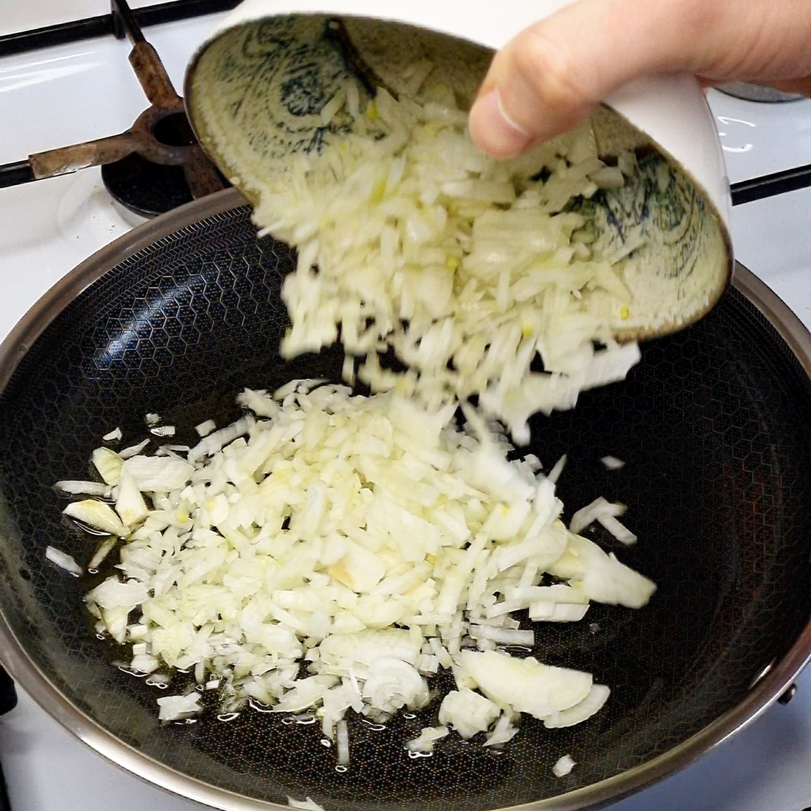 Smulkiai supjaustykite svogūną. Apkepkite alyvuogių aliejuje su trupučiu druskos, kol suminkštės. Tuomet sudėkite smulkintą česnaką ir trumpai pamaišykite, kad atsiskleistų kvapas.
