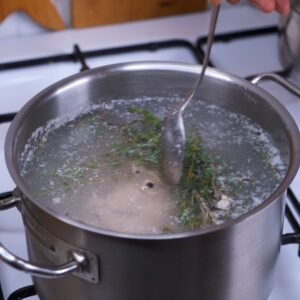 2. Į vištienos sultinį sudėkite čiobrelį ir juodųjų pipirų grūdelius. Užvirkite ir pavirkite apie 10 minučių. Po to nukoškite.