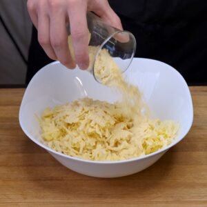3. Goudą ir cheddar sūrį sutarkuokite, sumaišykite tarpusavyje ir apibarstykite kukurūzų miltais. Lengvai permaišykite, kad sūris tolygiai pasidengtų.