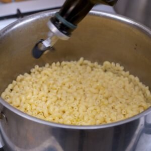 7. Makaronus išvirkite pagal instrukciją ant pakuotės. Nupilkite vandenį, supilkite alyvuogių aliejų ir lengvai permaišykite.
