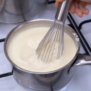 5. Atskirame dubenėlyje sumaišykite kreminį sūrį ir garstyčias. Nuolat maišydami įmaišykite šį mišinį į padažą.