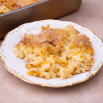 8. Makaronus suberkite į kepimo formą ir užpilkite paruoštu sūrio padažu. Išlyginkite paviršių.