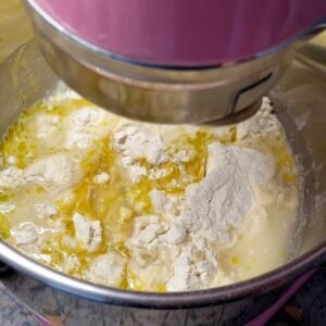 1. Į dubenį suberkite miltus, sausas mieles, cukrų ir druską. Supilkite vandenį, alyvuogių aliejų ir tešlą minkykite apie 10 minučių, kol ji taps vientisa ir elastinga.