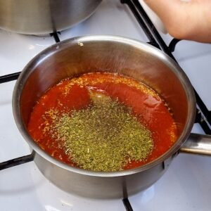 3. Kol tešla kyla, paruoškite padažą. Alyvuogių aliejuje lengvai apkepkite smulkintą česnaką. Supilkite pomidorų pasatą, įdėkite medų, berkite raudonėlio, rūkytos druskos ir juodųjų pipirų. Viską gerai išmaišykite ir kaitinkite ant silpnos ugnies apie 10 minučių.