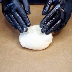 2. Tešlos kraštus palenkite į vidų, suformuokite kamuoliuką ir uždenkite maistine plėvele. Palikite kilti apie 1 valandą maždaug 24 °C temperatūroje.