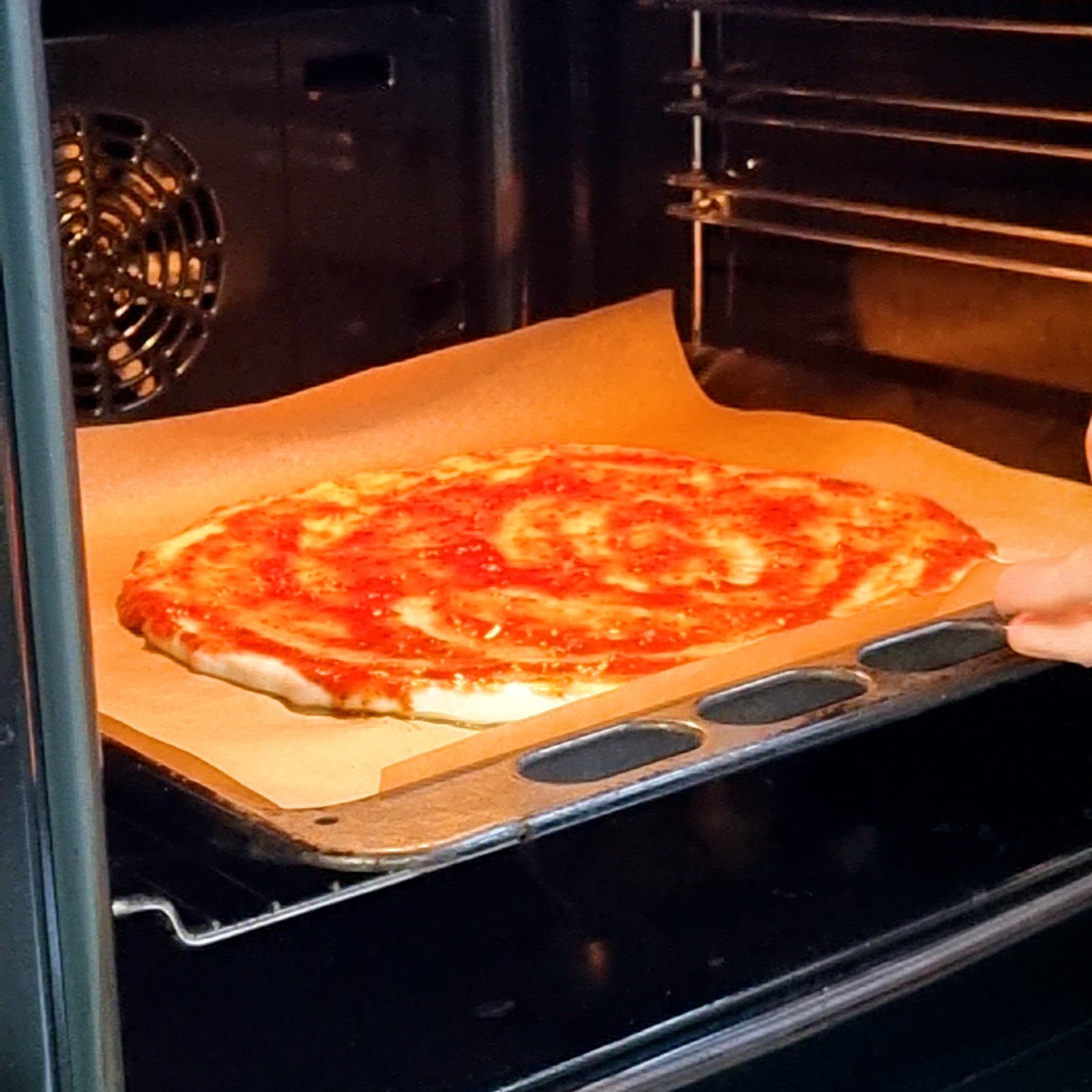 5. Picos pagrindą aptepkite padažu ir dėkite į iki 250 °C įkaitintą orkaitę, įjungę konvekciją ir apatinę kaitrą. Kepkite apie 4 minutes.