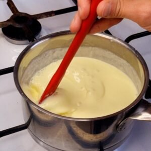 1. Į puodą supilkite pieną, grietinėlę ir vanilės ekstraktą.
