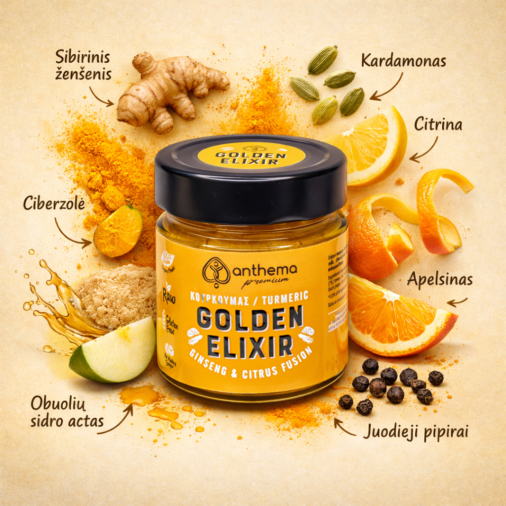 Auksinis! Ne tik dėl spalvos – labai graži skonio kompozicija. Patiko čia “suvaldyta” ciberžolė! Net žinant labai stiprias jos savybes, nevisada su noru išeina vartoti dėl tokio pat stipraus skonio. Šis eliksyras viską keičia – tiesiog skanauju po šaukštelį – sveikas mažas desertas prie rytinės kavos – puiki sudėtis, tikiu ir nauda 🙂 Dėkoju!