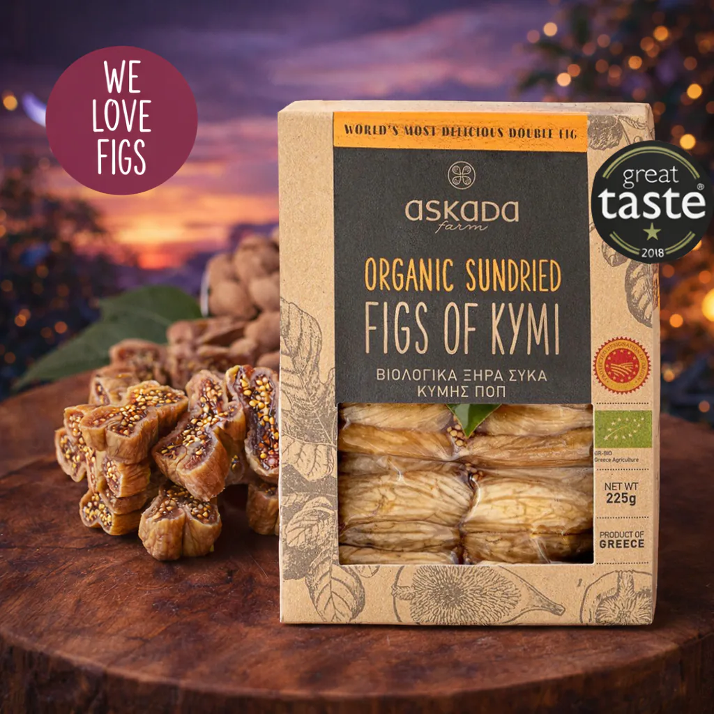 Kymio figos (PDO) iš Askada sertifikuoto ekologiško ūkio, džiovinamos saulėje. Kruopščiai atrinktos po vieną, jos gaminamos pagal tradicinį perdirbimo būdą, taikomą tik Graikijos Kymio regione (Eubojos saloje), kuris suteikia figoms būdingą porinę formą. Tai autentiškas Viduržemio regiono skanėstas, puikiai tinkantis tiek kasdieniam užkandžiui, tiek gurmaniškoms degustacijoms.