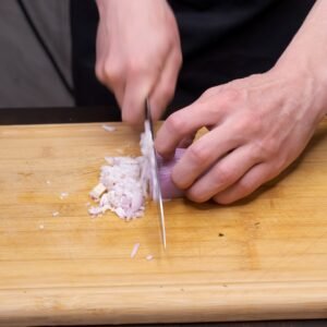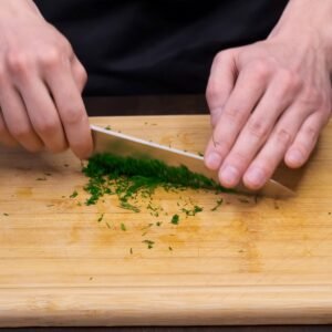 Labai smulkiai sukapokite krapus, o šalotinį svogūną smulkiai supjaustykite.