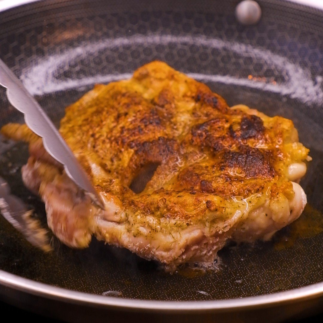 3. Keptuvėje įkaitiname alyvuogių aliejų ir apkepame vištieną iš visų pusių, kol išorė tampa traški, o vidus – pilnai iškepęs.