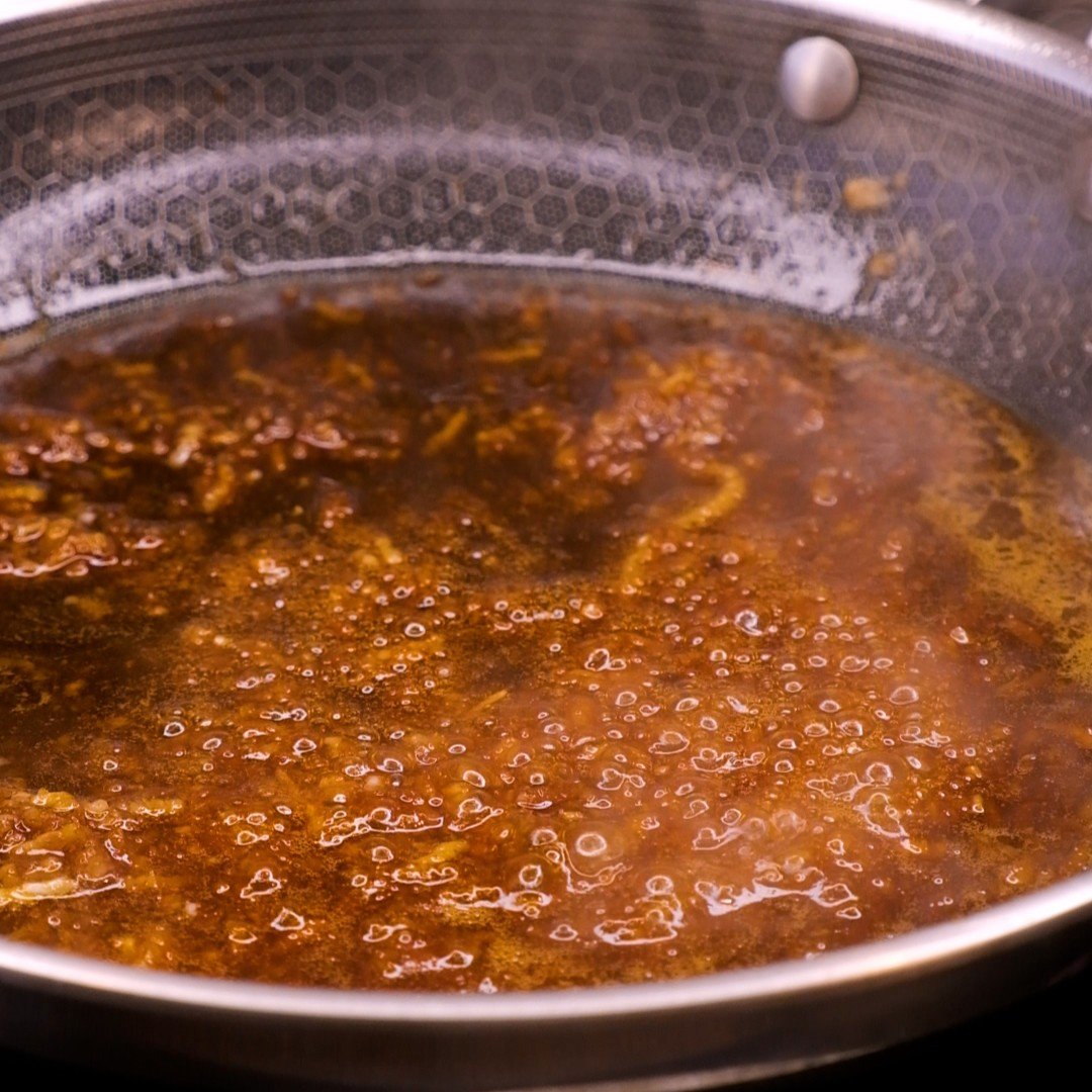 5. Į tą pačią keptuvę dedame sviestą, česnaką, sojų padažą, medų ir razinų sirupą su citrinos aromatu. Verdame kelias minutes, kol padažas sutirštėja.