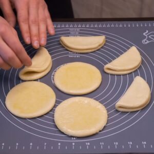 Pakilusią tešlą iškočiojame iki maždaug 5–7 mm storio. 10 cm skersmens žiedu ar stikline išspaudžiame apskritimus.