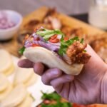 Bandelę atsargiai atveriame. Vieną pusę aptepame majonezu, kitą — figų čatniu.