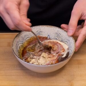 Dubenyje sumaišome passatą, rudąjį cukrų, sojų padažą, garstyčias, česnaką, svogūnų miltelius, druską su rūkyta paprika, juoduosius pipirus ir razinų sirupą su actu.